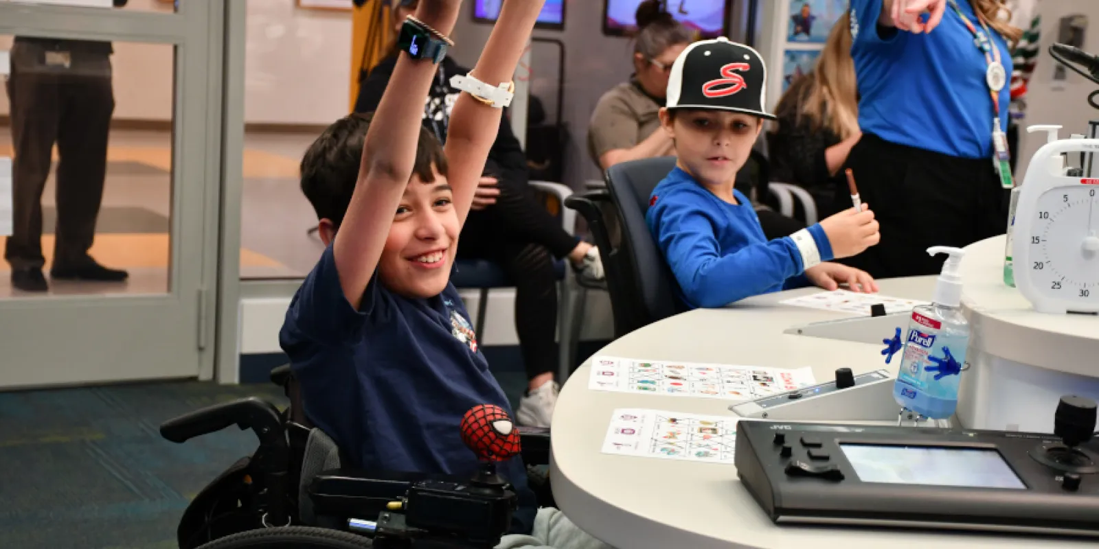 Woman holds left hand up in celebration as young boy sitting in wheelchair yells into microphone
