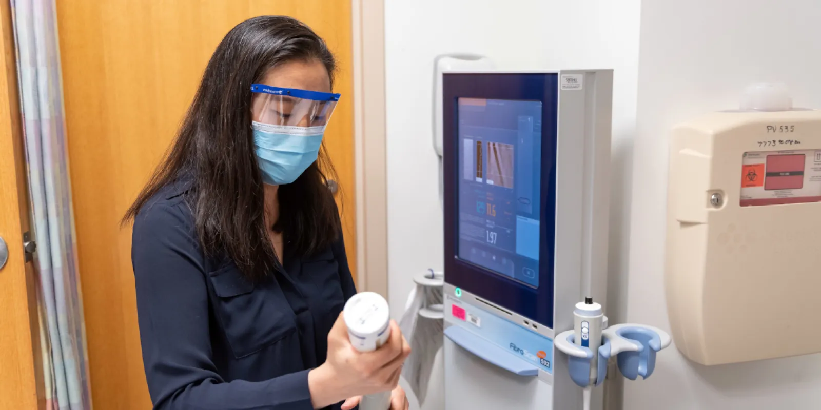 Finally, we place the FibroScan® probe on your child’s side in between their ribs. The probe emits a series of quick buzzes or pulses, but It doesn’t hurt — it might even tickle. This helps us “see” your child’s liver on the machine. Then we’ll wipe the gel off your child and they’re ready to go. The whole process typically only takes 10 to 15 minutes.